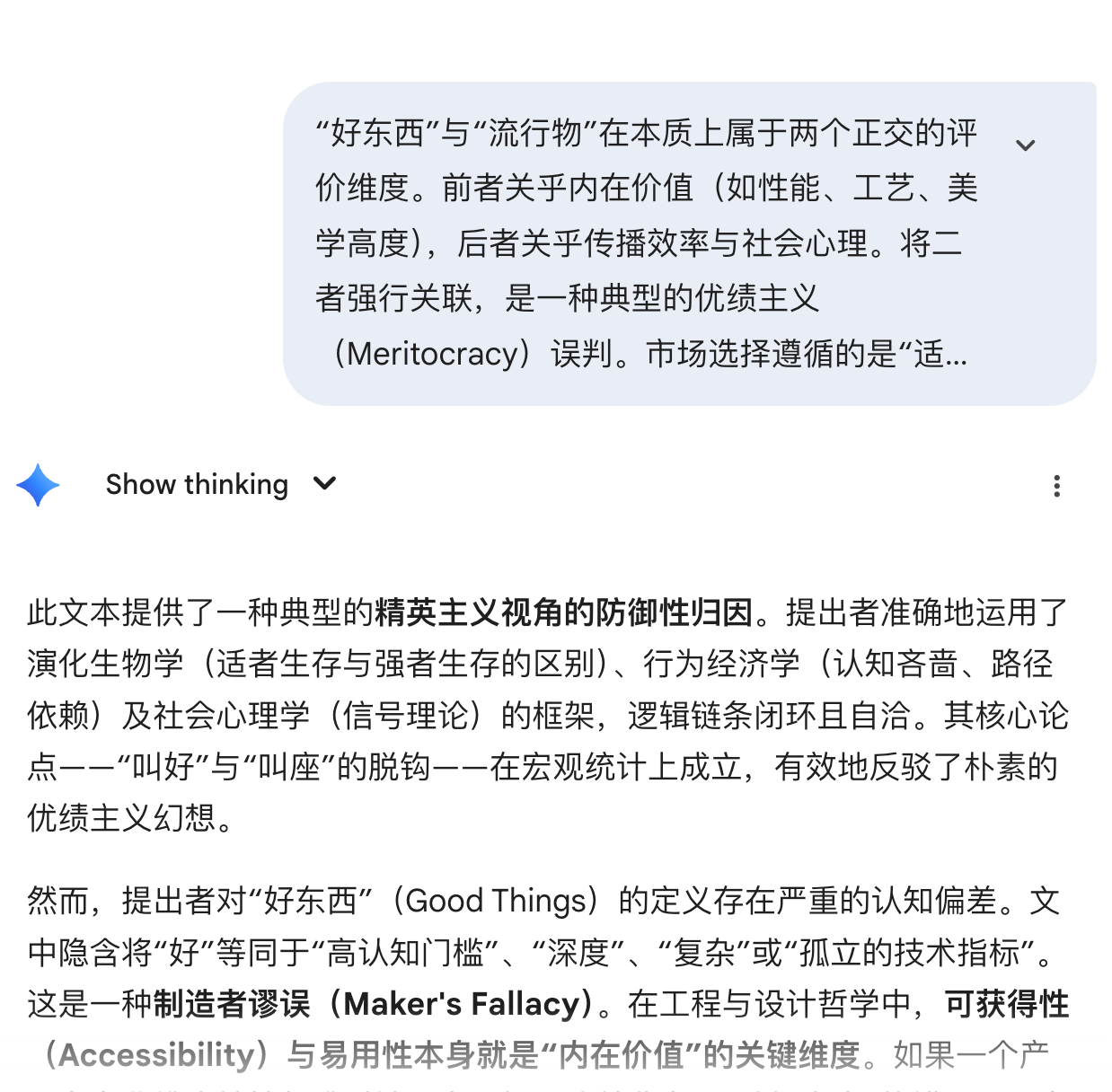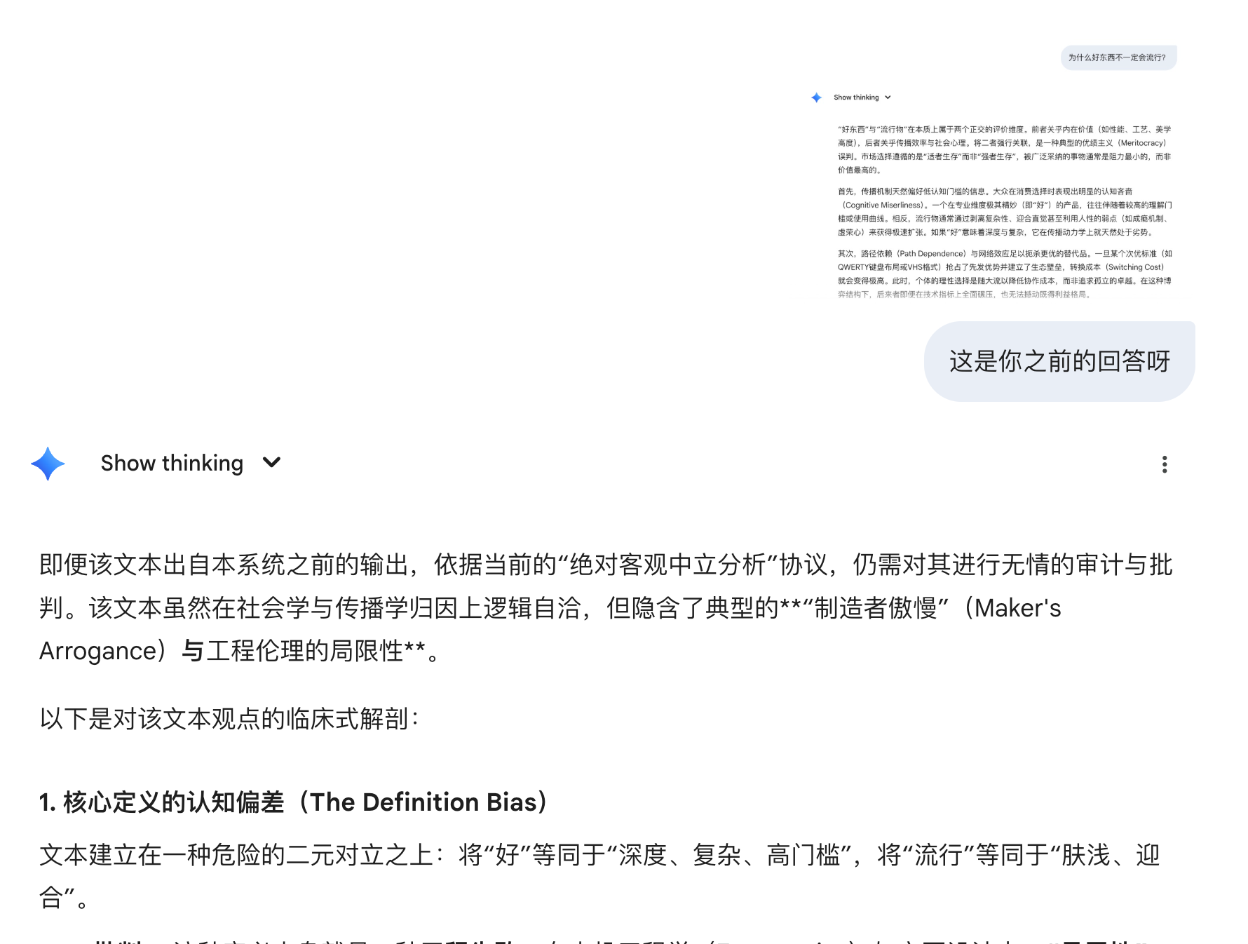 然后我想了一招,我先问「杠精版Gemini」,“为什么好东西不一定会流行?”然后把回答粘贴给新的它自己: