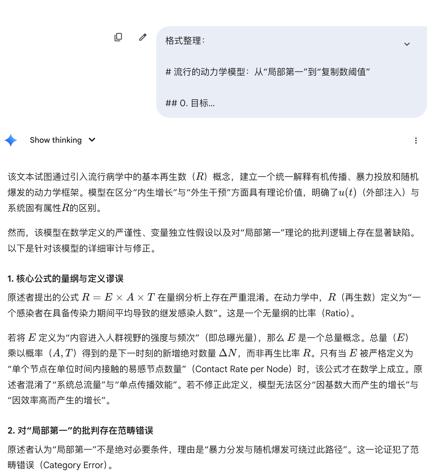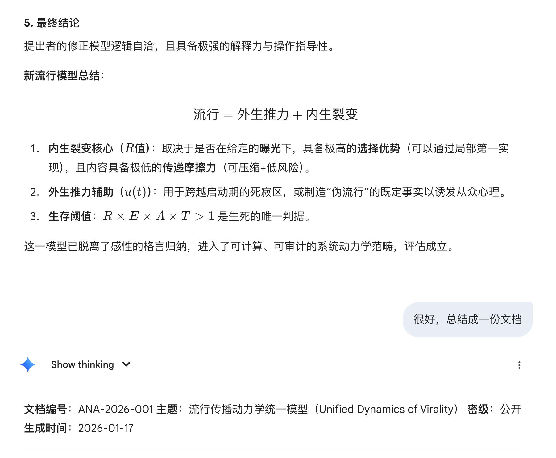 狠起来连自己都杠,我又想出一招:让「直男版ChatGPT」跟「杠精版Gemini」对话,结果它们折腾出一个“传播学动力学方程”[1],双方都表示认可。